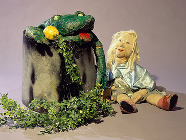 „Ach, wenn ich meine Kugel wieder hätte, da wollt‘ ich alles darum geben, meine Kleider, meine Edelsteine, meine Perlen und was es auf der Welt nur wär‘.“ Wie sie so klagte, steckte ein Frosch seinen Kopf aus dem Wasser und sprach: „Königstochter, was jammerst du so erbärmlich?“ „Ach, sagte sie, du garstiger Frosch, was kannst du mir helfen! Meine goldene Kugel ist mir in den Brunnen gefallen“ …Das Puppenspiel folgt dem Märchen, wie es von den Brüdern Grimm überliefert worden ist. Die Prinzessin, der Frosch-Prinz, der König, die Königin, der eiserne Heinrich, die goldene Kugel, der Brunnen, das Bett und die Wand spielen mit und erleben die Erlösung der Prinzessin von dem garstigen Frosch. Die Figuren sind zu aussagekräftigen, individuellen Charakteren geformt, doch das einfache märchenhaft Typische der Figuren, der Requisiten und der Handlung bleibt erhalten. „...da war‘s ein schöner junger Prinz. Der war nun ihr lieber Geselle, und sie hielt ihn wert wie sie versprochen hatte, und sie schliefen vergnügt zusammen ein.“ Das Spiel ist ein offenes Puppenspiel mit weichen, fast lebensgroßen Textilfiguren. Die Puppen werden auf dem Fußboden vor, manchmal zwischen den Kindern geführt. Der Spieler bleibt sichtbar, wird aber bald von den Kindern vergessen. Das Spiel ist einfach ein großes, lebendes, weiches, anfassbares Bilderbuch.