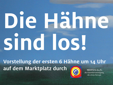 Die Künstlervereinigung Motus4 und das Citymanagement stellen die ersten sechs GFK-Hähne vor, die von den Mitgliedern von Motus4 in den letzten Wochen mit viel Engagement aufwendig gestaltet wurden. Die sechs Hähne zeigen die volle Bandbreite möglicher Gestaltungsformen, so wird ein Exemplar die traditionelle, portugiesische Bauernbemalung tragen, ein anderer wird im Pop-Art-Look daher kommen. Der nächste Hahn ähnelt einer riesengroßen Disco-Kugel und ist über und über mit kleinen Spiegel-Mosaiken bestückt. Ein weiterer Hahn ist Lissabon gewidmet und zeigt, wie auch Gegenstände in und an der Figur des Hahnes angebracht werden können. Aber auch Porträts sind möglich, was der nächste Hahn zeigt, der die Person der Düsseldorfer Galeristen „Mutter Ei“ aufgreift und die „bekannte Dame“ karikiert. Ein letzter Hahn zeigt, wie auch das „Corporate Design“ eines Unternehmens in das Projekt „Die Hähne sind los!“ integriert werden kann.