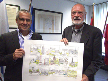 Anlässlich dieses Vorhabens wurde auch Clubmitglied Heinz-Gerd Karhausen um einen Beitrag gebeten. Seit Jahren schmücken weihnachtliche Langenfelder Motive des zeitweise an der Hochschule Anhalt in Dessau lehrenden Bauassessors die begehrten Lions-Advents-Kalender. Von 1980 bis 1996 arbeitete Karhausen als Stadtbaurat im Langenfelder Rathaus. Dort überreichte er Bürgermeister Frank Schneider jetzt als Startschuss für das Lions-Auktionsprojekt den ersten Abdruck der von ihm für den 4. Dezember geschaffenen „Langenfelder Ansichten“. Das circa A-1-große kolorierte Blatt zeigt 15 etwa 10 x 10 cm große Skizzen aus der Posthornstadt. Bürgermeister Frank Schneider räumte bei der Präsentation ein, „dabei einige völlig neue Ansichten“ gefunden zu haben. Neben den Klassikern wie St. Josef, Haus Arndt oder der Wasserburg Haus Graven zeigt Karhausen Skizzen unter anderem vom Segelflugplatz, von Becker & Bernhard oder vom S-Bahnhof. Das demnächst im Arbeitszimmer des Bürgermeisters zu sehende Bild ist mit „E.A.“ (Epreuve d´artiste) als Künstlerdruck zu erkennen, die für die Auktion vorgesehen Drucke sind fortlaufend nummeriert. Drei Exemplare sind von Heinz-Gerd Karhauseen koloriert, zwölf weitere Drucke werden in Schwarz-Weiß angeboten. (mmo)