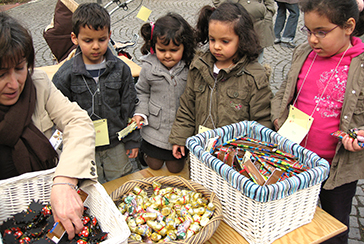 Beigeordneter Roland Liebermann und Mo.Ki-Koordinatorin Inge Nowak eröffneten das Fest. Das Mo.Ki-„unter 3“-Team mit Sandra Pantuschky, Gülendam Yilmaz, Renate Sdun und Miriam Heckmann wurde tatkräftig unterstützt von der städtischen Musikschule, der VHS-Kunstschule und der Frühförderung der Lebenshilfe. Die Kinder konnten sich an drei Aktionsständen austoben und zugleich ihre Teilnahmekarte abstempeln lassen, für die der Osterhase kleine Schokoladenpräsente bei Mo.Ki „unter 3“ abgegeben hatte. Mit der Kunstschule wurden versteckte Osterhasen gemalt und gebastelt, mit den Mitarbeiterinnen der Frühförderung konnte in Wühlwannen nach Eiern gefischt werden und bei der Musikschule wurde musiziert – auch wurden kleine Musikinstrumente für Zuhause gebastelt. Anschließend konnten die Kinder im Rathaus-Center und einigen Läden am Eierplatz Schokoladeneier suchen, die das Mo.Ki-Team versteckt hatte.