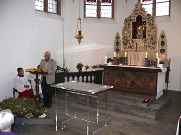 „Er ist da und doch kaum zu sehen.“ Mit diesen Worten präsentierte Hans Schnitzler, Vorsitzender des Marienkapellenvereins, den neuen „gläsernen“ Altar in der fast 500 Jahre alten Kapelle am Rhein den rund 100 Besuchern. Er ersetzt den bisherigen, etwas sperrigen Holzaltar. Zuvor hatte Pfarrer Attila Kiss, der aus Siebenbürgen stammt und die Urlaubsvertretung für Pfarrer Burkhardt Hoffmann übernommen hatte, den neuen Altar im Rahmen der Kräutermesse der Katholischen Frauengemeinschaft (kfd) eingeweiht. „Ein Altar, der nicht sichtbar ist – genau wie Gott“, so die Worte von Pfarrer Kiss bei der Einsegnung. Da der bisherige hölzerne Altar die Sicht auf den Marienaltar versperrte, war allen Beteiligten klar, dass hier eine andere Lösung gefunden werden musste. Mit Ludger Scholten, Langenfelder Mitglied im Monheimer Marienkapellenverein, fand Hans Schnitzler den richtigen Mann für die richtige Lösung. Scholten hatte in seiner beruflichen Zeit mit der Firma Kreideweiss-Kunststoffe aus Velbert-Neviges zu tun, die auf die Herstellung transparenter Gegenstände spezialisiert ist. Zudem hatte sich Scholten im Vorfeld bei einer Kirche in der Schweiz informiert, die ebenfalls einen transparenten Kunststoffaltar besitzt.