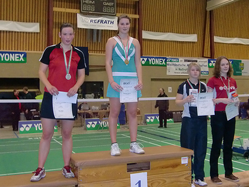 Im Dameneinzel startete die für den FC Langenfeld spielende Fabienne von Setzplatz 3/4 im unteren Tableau mit einem Freilos in der ersten Spielrunde. Dann stand das Spiel gegen Lea Palermo aus Frankreich an. Lea hatte ebenso wie Fabienne an den 1. Olympischen Jugendspielen in Singapur im August 2010 teilgenommen. Aber dem Spiel von Fabienne konnte sie nichts entgegensetzen. Mit 21:13 und 21:14 gewann Fabienne ihr Auftaktmatch. Danach war die Dänin Ditte Larsen Strunge die nächste Gegnerin. Aber auch hier behielt Fabienne mit 21:17 und 21:17 die Oberhand. Im Achtelfinale musste Fabienne nun gegen Sonia Olariou (Rumänien) spielen. Im ersten Satz konnte sich Fabienne ab dem 5:5 immer mit mehr als fünf Punkten sicher absetzen. Dies änderte sich in Satz zwei. Sonia führte durchweg mit fünf Punkten Vorsprung und hatte sich bereits ein sicheres 18:13 herausgearbeitet. Aber dann drehte Fabienne an der „Temposchraube“ und machte sechs Punkte in Folge zum 19:18. Sonia gelang noch der 19:19-Ausgleich, doch die beiden folgenden Punkte zum 21:19 gehörten wiederum Fabienne. Im Viertelfinale wartete die Schweizerin Nicole Schaller (Setzplatz 5/8). Bis zum Zwischenstand von 10:7 im ersten Satz konnte Nicole das Spiel noch offen halten. Aber dann erarbeitete Fabienne Punkt für Punkt und machte aus dem 7:10 eine 13:10-Führung, die sie dann bis zum Ende des ersten Satzes mit 21:17 nicht mehr abgab. Im zweiten Satz konnte Nicole dem Tempo und den präzisen Schlägen von Fabienne nicht mehr folgen. Ab dem 2:2 holte sich Fabienne einen Punkt nach dem anderen und siegte ungefährdet 21:11. Am Samstagvormittag stand nun das Halbfinale auf dem Programm. Hier kam es zu der Begegnung mit der Spanierin Beatriz Coralles. Sie hatte in Runde vier die topgesetzte Russin Romina Gabullina (Setzplatz zwei) aus dem Turnier geworfen. „Reicht die Kraft für ein weiteres Topspiel für Fabienne?“, fragten sich die Beobachter. Da die Spanier im Mannschaftskampf bereits in der Vorrunde ausgeschieden waren, mussten sie drei kraftraubende Begegnungen weniger bestreiten und konnten so auch wieder neue Kräfte sammeln und sich für das Individualturnier neu sammeln. Fabienne begann das Spiel mit einigen leichten Fehlern, die Beatriz zu einer 11:7-Pausenführung nutzte. Fabienne kämpfte sich hier noch einmal auf 12:12 heran, musste aber dann der Spanierin mit 17:21 den Satz überlassen. Konnte sie noch einmal kontern? Nein, Fabienne erarbeitete sich zwar einen knappen 4:2-Vorsprung, der aber dann schmolz und Beatriz erarbeitete sich Punkt für Punkt den zweiten Satz mit 21:11. Mit dem Erreichen des Halbfinals hatte sich Fabienne einen Podestplatz und damit die Bronzemedaille gesichert. Diese Europameisterschaft, von der Fabienne eine Goldmedaille mit der Mannschaft und eine Bronzemedaille im Einzelwettbewerb mit nach Hause bringt, war ein weiterer Höhepunkt in ihrer Jugendkarriere, aus der sie sich nun altersbedingt verabschiedet.