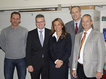 Auf dem Foto sind zu sehen (von links nach rechts): Jörg Körschgen (Anwendungstechniker), Dr. Michael Arndt-Rosenau (Leitung Fertigung und Entwicklung), Michaela Noll MdB, Stefan Sommer (Geschäftsführer), Dr. Ulrich Girrbach (Direktor). Foto: Büro Noll