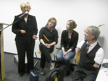 Hilde Weidenfeld dankt Pfarrer Rainer Schmidt für seinen einzigartigen Vortrag. Dazwischen die Musiker Hagen Goar Bornmann und Caroline Günther. Foto: Steinbrücker