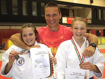 Hier kämpften am letzten Wochenende die Judokas zwischen zehn und dreizehn Jahren um die höchsten Titel ihrer Altersklasse. Äußerst erfolgreich kehrten die sehr gut vorbereiteten JCL-Nachwuchsathletinnen und -athleten aus Herne zurück. JCL-Talent Delia Grigo stand in der Klasse bis 52 kg in Herne auf der Wettkampffläche. Delia wurde allen Erwartungen an eine Favoritin gerecht, denn sie konnte ihre Gegnerinnen im Sekundentakt mit verschiedenen Wurftechniken vorzeitig in die Trostrunde schicken. Im Halbfinale gegen die starke Bezirksmeisterin aus Münster, Jennifer Rollfinke, setzte Delia bereits nach 25 Sekunden zu einer zwingenden Spezialtechnik an und erreichte somit ungefährdet das Finale. Delias Finalgegnerin Mareike Utsch, Bezirksmeisterin aus dem Bezirk Köln, gestaltete ihren Finalkampf sehr passiv, dies nötigte Delia in die Golden-Score-Verlängerung. Nach nur wenigen Sekunden gelang der beständig angreifenden Delia jedoch ein Wurf, für den es eine halbe Punktwertung gab; und augenblicklich setzte Delia klug nach, um ihre Gegnerin mit einem unüberwindbaren Haltegriff zu besiegen: Gold! Delias Titelgewinn ist der bisher größte Erfolg in ihrer noch jungen Judolaufbahn, zudem schreibt sich die dreizehnjährige Schülerin des KAG mit ihrer sensationellen Leistung als jüngste Westdeutsche Meisterin in die Vereinsgeschichte des JC Langenfeld ein.