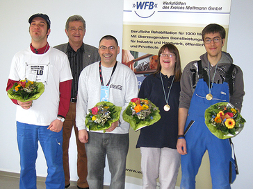 Sie nahmen vor einigen Wochen an den „Special Olympics National Winter Games“ in Altenberg/Erzgebirge teil. Es handelt sich um Boris Drasler, Hilden (Ski Alpin, zwei vierte Plätze), Alexander Fleckenstein, Hilden (Ski Alpin, einmal vierter Platz, einmal sechster Platz), Matthias Pütz, Langenfeld (Snowboard, einmal Bronze, einmal Gold) und Stefanie Wiegel, Langenfeld (Snowboard, zweimal Gold). „Wir fördern bei unseren Mitarbeitern jede Art von Sport, ob Fußball, Tischtennis, Schwimmen oder die Teilnahme an Special- Olympics-Wettbewerben. Damit die Teilnahme an den Special-Olympics-Spielen nicht am Urlaub scheitert, haben wir uns beim Landschaftsverband Rheinland dafür eingesetzt, dass die SPO-Teilnehmer für diese Wettbewerbe Sonderurlaub erhalten“, so Feilhauer, Geschäftsführer der WFB-Werkstätten des Kreises Mettmann. Den vier in den WFB-Werkstätten beschäftigten Sportlerinnen und Sportlern gratulierte Geschäftsführer Heinrich Feilhauer ganz herzlich zu ihrer erfolgreichen Teilnahme mit einem Blumenstrauß.