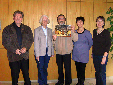 Von links nach rechts: Werner Köhl, (Gründungspräsident des Lions Clubs Monheim am Rhein-Alte Freiheit), Hildegard Poduschnick (Präsidentin des Lions Clubs), Friedemann Fey (Fotograf des Adventkalendermotivs), Kerstin Ludwig (Bayer Animal Health GmbH), Mireille Wittkowski (Lions Club). Foto: Lions Förderverein