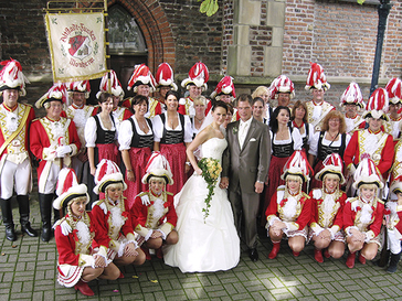 Bei strahlendem Sonnenschein trafen sich etliche Altstadtfunken und Altstadtfrauen, um für das Brautpaar Spalier zu stehen. Funkendiakon Josef Kürten traute das junge Paar in der Marienkapelle nahe dem Rhein. Beide tanzen schon seit einigen Jahren bei den Aktiven im rot-weißen Traditionskorps. Die Altstadtfunken hoffen, dass sie dem Verein noch lange erhalten bleiben.