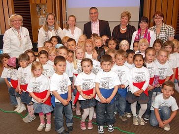 Der Bürgersaal diente dabei nicht nur der Ausstellungseröffnung durch Bürgermeister Frank Schneider, sondern war gleichzeitig Bühne für den Lummerland-Chor und Kinosaal für einen Überraschungsfilm, der die Einrichtung vorstellte. Der Bürgermeister ging in seiner Laudatio auf die veränderten Bedingungen in der Betreuung der Kleinsten im Laufe der letzten sechs Jahrzehnte ein.