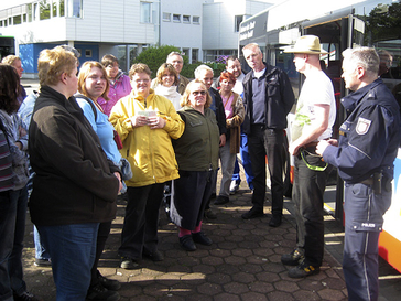 Polizeioberkommissar Giesen und Verkehrsmeister Kleinert hatten noch viele Tipps parat. Zum Beispiel solle man an der Bushaltestelle Abstand halten, weil der Bus ausschwenke und zusätzlich der Außenspiegel noch weit in den Haltestellenbereich hineinragten. „Mindestens einen großen Schritt von der Bordsteinkante wegbleiben. Und beim Aussteigen erst nach links und rechts schauen, ob Radfahrer kommen.“ Geübt wurde auch das Aufklappen der Plattform für Rollifahrer, das gleich mehrere Mitarbeiter ausprobierten. Und über Notfallsituationen wurde informiert: Nothammer, Notausgänge, Nothahn an der Mitteltür. „Im Notfall sollte man immer die Ruhe bewahren“, betonte Kleinert. (jste)