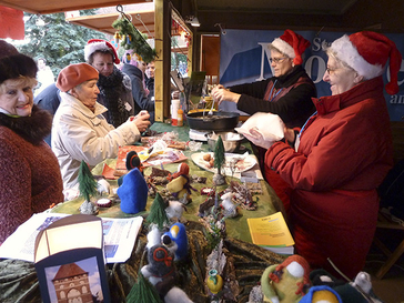 Im Schatten des Weltkulturerbes Marienburg boten Händler an 22 Ständen zum zweiten Mal Filzwaren, Weihnachtsschmuck und regionale Spezialitäten an. Mit dabei waren auf Einladung der Burgverwaltung auch die beiden deutschen Partnerstädte von Malbork. Am Monheimer Stand trafen die interessierten Besucher unter anderem auf Bürgermeister Daniel Zimmermann. „Während der Stand von Nordhorn vor allem Glühwein im Angebot hatte, gab es bei uns Printen, Spekulatius und frischgebackene Zimt-Muzen“, berichtete Zimmermann. Der Verwaltungschef wurde begleitet von Margret Jenniches, der Vorsitzenden des Freundeskreises Malbork, Ursula Niebuhr, der städtischen Koordinatorin für die Partnerschaft mit Malbork und Leiterin des Programmbereichs Sprachen der Volkshochschule, sowie von Beate Hellingrath, der Leiterin des Vorstandsbüros.