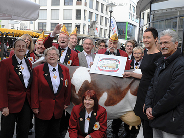 Den neuen Orden ziert nun das „sass.am.markt“-Gebäude, das sich im Besitz der Hamborner Reit AG befindet. Durch die Vermittlung des stellvertretenden Bürgermeisters Dieter Braschoss kam der Vorstand der Spieß-Ratzen mit Vertretern der Hamborner Reit AG ins Gespräch. Sybille Albeser, Leiterin Investor Relations, traf sich mit Wolfgang Christmann von den Karnevalisten, um Details zu besprechen. Albeser und Vorstandsmitglied Hans Richard Schmitz von dem im Immobiliensektor tätigen Unternehmen bekamen nun bei einem kleinen Umtrunk im „Swiss Break“ einen Orden seitens der Karnevalsgesellschaft überreicht.