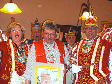 Da ließ es sich das Prinzenpaar Inge und Alexander nicht nehmen, mit viel Tamtam im Einrichtungsmarkt einzuziehen und Marktleiter Willibald Lukas zu danken. Die Tollitäten nahmen den Marktleiter bei dieser Gelegenheit in den erlauchten Kreis der Jecken auf und überreichten ihm den diesjährigen Sessionsorden. Natürlich wurde Willibald Lukas auch mit einem dreifachen „Monnem Helau“ bedacht – und er war hellauf begeistert ob der freundlichen Ehrerbietung. „So eine Begrüßung wünsche ich mir jetzt jeden Tag auch im Markt“, schmunzelte Lukas, der zugab: „Eigentlich bin ich nicht unbedingt ein Karnevalist – aber was nicht ist, kann ja noch werden.“ Immerhin gehört er auch dem diesjährigen Elferrat der „Schwalbenjecke“ an. „Ein guter Anfang“, befand auch das Prinzenpaar.