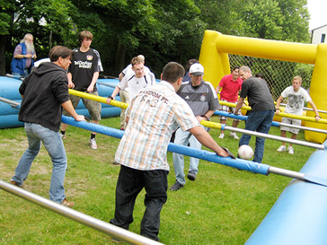 „Genießen Sie den Erlebnisgarten der WFB. Schauen Sie sich spannende Spiele der Lebendkicker an. Clown Ötti unterhält große und kleine Besucher, zaubert und bastelt Figuren aus Luftschlangen. Auf der Bühne sind Sketche, asiatischer Drachen, Tanzprogramm, Karaoke und die WFB-Kellergang zu sehen und zu hören. Die leckeren WFB-Bratkartoffeln, Grillfleisch, Salatbar, Kaffee und Kuchen, Eis und karibische Cocktails sowie erfrischende Getränke stillen Hunger und Durst. Zur Unterhaltung spielt ab 18.30 Uhr die Akustik-Coverband Glasgow Kiss, deren besonderes Markenzeichen mehrstimmiger Gesang ist. Mitarbeiter, Fachpersonal, Geschäftsleitung, Werkstattleitungen und der Vorstand des WFB-Fördervereins würden sich freuen, wenn Sie an diesem schönen Fest teilnehmen könnten“, machen die Werkstätten einen Besuch des Festes schmackhaft.