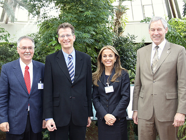Auf dem Foto sind zu sehen (von links nach rechts): CDU-Landtagskandidat Hans-Dieter Clauser, Dr. Ralf Brauksiepe MdB (Parlamentarischer Staatssekretär bei der Bundesministerin für Arbeit und Soziales), Michaela Noll MdB, Lykele van der Broek (Vorstandsmitglied von Bayer CropScience). Foto: Büro Noll