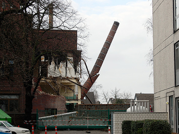 Das Monheimer Zentrum bekommt ein neues Gesicht. Im Zuge des Neubaus „Monheimer Tor“ wird auch der Busbahnhof umgestaltet. Und an der Biesenstraße weichen die Gebäude, in denen früher die Brauerei „Peters und Bambeck” Alt, Kölsch und Kräusen-Pils braute, insgesamt 36 Niedrigenergie- und Passivhäusern zur Privatnutzung. Diese Neubauten sind teils schon verkauft, teils sehr intensiv nachgefragt. Um den Turm zu Fall zu bringen, war nicht viel Sprengstoff nötig, das Paket war nicht größer als ein Stück Butter. Mit der Routine von 50 Jahren Berufserfahrung brachte Sprengmeister Wilhelm Witzgall den Schornstein um Punkt 14 Uhr zu Boden. Die Anwohner mussten kurz vor 14 Uhr zur Sicherheit ihre Häuser verlassen.