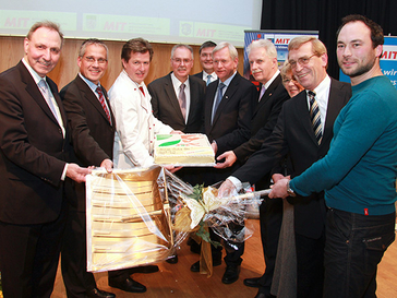 Von links nach rechts: Wolfgang Leyendecker (Vorsitzender MIT Kreis Mettmann), Langenfelds Bürgermeister Frank Schneider, Bäckermeister Manfred Jung, Hans-Dieter Clauser MdL (Vorsitzender MIT Langenfeld), Harald Giebels MdL, Landtagspräsident Eckhard Uhlenberg, Landrat Thomas Hendele, Gabi Hackel (stellvertretende Vorsitzende MIT Monheim am Rhein), Fred-Harry Frenzel (Vorsitzender MIT Hilden) und Sven Bobe (Gewinner des „Goldenen Schneeschiebers“).