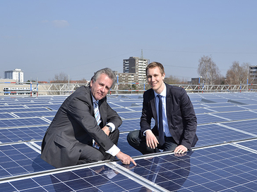 Zur Präsentation der Anlage standen gestern Bürgermeister Daniel Zimmermann und MEGA-Geschäftsführer Udo Jürkenbeck auf dem Dach der OHG-Sporthalle.