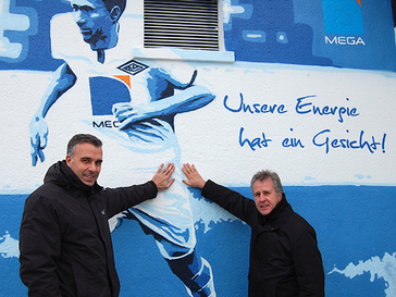 Gegen unerwünschtes Sprayen hilft nur eins – erwünschtes Sprayen, diese Politik greift an der Baumberger Chaussee ebenso wie am MEGA-Häuschen am Kielsgraben. „Seit Peter Norf die Station bemalt hat, gibt es keine Schmierereien mehr“, sagt Werner Geser, Pressesprecher des Monheimer Energieversorgers. „Vorher sah die Station unmöglich aus.“ Die „wilden“ Sprayer scheinen Respekt vor der Kunst von Peter Norf zu haben. Der Monheimer hat auch für die Stadtwerke Düsseldorf und für private Auftraggeber unscheinbare Häuschen und Mauern in echte Blickfänge verwandelt. Dort naturgemäß mit Granden der Fortuna, in Baumberg mit einem Spieler ohne reales Vorbild, aber mit einem Trikot, das unschwer als eines der Sportfreunde Baumberg zu identifizieren ist. Daneben zieren Windkrafträder die Mauern des Häuschens und der Spruch „Unsere Energie hat ein Gesicht“.