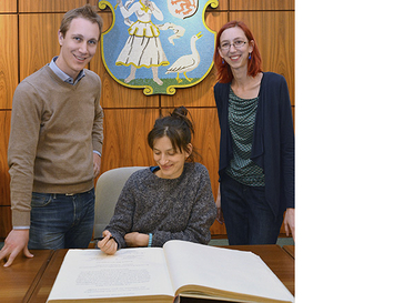 Ins Goldene Buch der Stadt hat sich die Schriftstellerin Lara Schützsack am Donnerstag nach einer kleinen Stadtbesichtigung mit Besuch im Ulla-Hahn-Haus eingetragen.