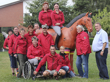 Das deutsche Para-Equestrian-Team absolvierte im Pferdesportzentrum Rheinland die letzte Formüberprüfung vor der Reise zu den Paralympics. Im Bild von links nach rechts zu sehen: Heidi Weifen, Dr. Bernadette Unkrueer, Hannelore Brenner, Dorte Christiansen, Heinrich Brähler, Britta Näpel, Dr. Angelika Trabert (hinten auf dem Pferd sitzend), Steffen Zeibig, Lena Weifen (vorne auf dem Pferd sitzend), Bernhard Fliegl, Romy Anton-Eger, Britta Bando und PSVR-Geschäftsführer Rolf-Peter Fuß. Foto: PEMAG