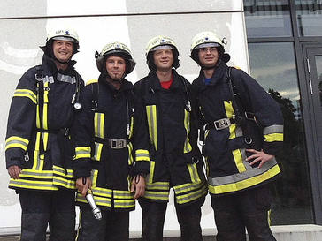 Auch gab es bei diesem Lauf ein Quartett der besonderen Art. „Ich und drei andere Kollegen sind bei dem Sparkassenlauf mitgelaufen. Wir sind bei der Feuerwehr Langenfeld und haben uns den Spaß gemacht, mit kompletter Brandschutzkleidung, Helm und Atemschutzgerät zu laufen. Wir haben die zehn Kilometer in gut 56 Minuten zurückgelegt in einem Vierer-Staffellauf“, berichtet Siegfried Zetzmann über sich und seine Mitstreiter Guido Bremer, Martin Wirtz und Thomas Krause. Die Motivation? Zetzmann: „Wir wollten den Leuten mal zeigen, wie fit wir sind. Obwohl wir ´nur´ von der Freiwilligen Feuerwehr sind, müssen wir trotzdem genauso fit sein wie Berufsfeuerwehrleute. Und es sollte natürlich auch ein bisschen Werbung sein, um neue Mitglieder zu werben; die Leute sollten mal sehen, dass die Feuerwehr nicht nur Brandbekämpfung oder technische Hilfe leistet. Wir sind eine recht große Gruppe. die seit 2008 jährlich beim ´Firefighter Skyrun´ in Düsseldorf teilnimmt; das heißt: den Düsseldorfer Rheinturm hoch in voller Montur oder den ARAG-Tower in Düsseldorf mit 28 Etagen. Auch waren wir beim Kölner Treppenlauf (39 Etagen) dabei. Es ist schon eine sehr hohe Belastung, der wir uns aussetzen. Aber was man nicht alles tut, um fit zu sein …“