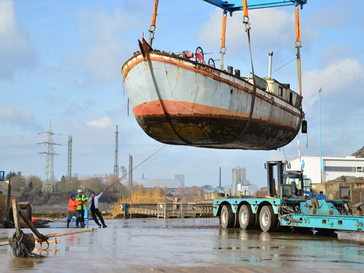 In Krefeld wurde das 35 Tonnen schwere Schiff mit einem Kran aus dem Wasser gehoben und auf einen Lastwagen gesetzt. Mit Polizeibegleitung machte sich der Schwertransporter dann nachts auf den Weg in Richtung Berlin. In einer Werft bei Oranienburg wird der Schokker nun von Farbanalytikern und weiteren Fachmännern begutachtet. „Nach einer ersten Untersuchung besprechen wir in Zusammenarbeit mit dem LVR die nächsten Schritte”, erläutert Richtzenhain. Im Oktober soll das Schiff dann seine vorerst letzte Reise zurück ins Rheinland antreten und als Teil der MonChronik auf dem Parkplatz an der Klappertorstraße aufgeständert werden. Der Standort eignet sich besonders, da sich in direkter Nähe nicht nur zwei ehemalige Aalräuchereien, sondern auch die ehemaligen Anlegestellen für die beiden Baumberger Aalschokker befinden. Auf und an dem unter Denkmalschutz stehenden Schiff können Besucher dann die Geschichte des Aalfangs erleben. „Bis dahin ist aber noch viel zu tun”, weiß Richtzenhain. „Das Grobkonzept steht bereits und beinhaltet viele schöne spielerische Ideen, auf die sich Besucher freuen können!” (bh)