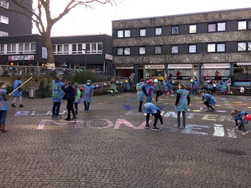Die Schüler entschieden sich für ein buntes Kunstprojekt in der Innenstadt: „Wir haben überlegt, was wir in unserer Welt verändern wollen. In den letzten Jahren hat sich in der Innenstadt, zum Beispiel am Busbahnhof, viel verändert. Wir wollten auch in die dunkleren Ecken der Stadt ein wenig Farbe bringen”, berichtet der 14-jährige Enzo. Die Aktion begann am Donnerstag gegen 11.30 Uhr am Eierplatz mit einem gemeinsamen Tanz. Springend, tanzend und auf Skateboards kamen die Schüler in ihren bunten Müllsäcken dann zum Ernst-Reuter-Platz, unterwegs verteilten sie Flyer. Mit Sprühkreide, bunter Wolle und lauter Musik gestalteten sie die Fläche nach ihren Vorstellungen. „Wir haben hier viel organisiert. Das ist schon irgendwie bewegend, die Aktion jetzt zu erleben”, freut sich die 14-jährige Kathrin. Auch Stadtteilmanager Georg Scheyer ist begeistert: „Die Aktion ist toll; so bunt wie das Berliner Viertel, das passt zu uns. Die Jugendlichen beweisen hier viel Engagement und eine unglaubliche Kreativität. Und die Anlieger sind begeistert.” (bh)