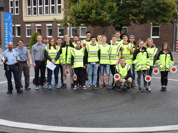 Gruppenbild nach der Ehrung: Für die Schülerlotsen ging es als Dankeschön anschließend ins Phantasialand. Mit auf dem Foto sind außerdem (von links) Bernt Siudzinski (Polizei), Lehrer und Projektleiter Tim Umlauf, Bürgermeister Daniel Zimmermann und Alexander Groß, von Seiten der Stadtverwaltung zuständiger Koordinator. Foto: Norbert Jakobs