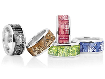 In Zusammenarbeit mit einem erfahrenen Juwelier hat Marke Monheim kurz vor dem Weihnachtsfest einen ganz besonderen Silberling mit einer Extraportion Stadtkolorit herausgebracht. Der Monheim-Ring ist da. Er zeigt in farbenfroher Form zahlreiche Sehenswürdigkeiten der Stadt – das Deusser-Haus und die Sankt-Gereon-Kirche, den Schelmenturm in der Altstadt und den Gänseliesel-Brunnen vor dem Rathaus, die Marienburg, Haus Bürgel und den Aalschokker auf dem Rhein. Jeder Ring wird in Handarbeit hergestellt und besteht aus 925er Sterlingsilber, kombiniert mit einer speziellen Hightech-Keramik. Den Monheim-Ring, gestaltet in unterschiedlichen Farben, gibt es ab sofort in der Geschäftsstelle des Marke Monheim e.V., am Rathausplatz 20, zu kaufen. Er kostet 129 Euro.