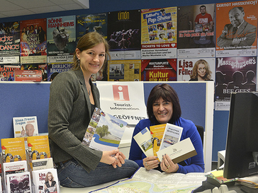 In Monheim am Rhein gibt sich nicht nur kulturell, sondern auch in Sachen Natur, Geschichte und Erholung vieles zu entdecken. Die städtische Tourismusbeauftrage Maximiliane Richtzenhain (links) und Marke-Monheim-Mitarbeiterin Regina Völlmecke weisen in der neuen Tourist-Information die schönsten Wege ins Freizeit-Vergnügen. Foto: Thomas Spekowius