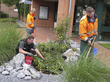 Ein Blick auf die schön gestaltete und gut gepflegte Anlage vor dem Gebäude löst bei ihnen oft positive Gedanken aus. „Die Kollegen sind sehr zufrieden damit, und einige sagen auch schon mal, das ist wie im Kurort“, berichtet Axel Eisenmann, bei der Kreispolizeibehörde Mettmann zuständig für Liegenschaftsangelegenheiten. Gruppenleiter Andreas Barnick von der WFB Langenfeld hat mit seiner WFB-Arbeitsgruppe im vergangenen Jahr die Beete neu angelegt und gestaltet, seitdem werden sie wie auch die Pflanzflächen im Hof regelmäßig gepflegt. „Im vorderen Bereich auf der rechten Seite musste eine Gestaltungsform gewählt werden, die das Erreichen der Fahnenmasten möglich macht“, berichtet Barnick. Die Pflanzenauswahl sei so gewählt worden, dass diese bei der nach Süden ausgerichteten Fläche nach der Entwicklungspflege sehr trockenresistent sein müssen. Neben Gräsern und Bodendeckern wurden auch fünf Jungbäume gepflanzt und eine Rasenfläche angelegt. „Unsere Mitarbeiter hatten hier die Möglichkeit, ihre Fertig- und Fähigkeiten in Sachen Neugestaltung zu erweitern“, so Barnick. Im Hof der Polizeiwache werden vor allem die Büsche in Form geschnitten und die Bodenflächen gesäubert, so dass auch hier ein gepflegter Eindruck entsteht. Als sehr wichtig sieht Andreas Barnick auch eine ständige Vegetationskontrolle an den angrenzenden öffentlichen Verkehrsbereich an. (jste)