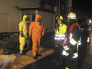 Am frühen Dienstagabend liefen dort etwa 1000 Liter Natronlauge aus einem Behälter und breiteten sich im Kellergeschoss der Firma aus. Zwei Mitarbeiter wurden durch die ätzende Flüssigkeit leicht verletzt und nach notärztlicher Erstversorgung durch den Rettungswagen der Feuerwehr in eine Düsseldorfer Spezialklinik transportiert. Die Feuerwehr rückte mit Schutzanzügen in den Keller vor und verhinderte dort die weitere Ausbreitung der Lauge sowie die chemische Reaktion mit anderen Stoffen. Einsatzleiter Torsten Schlender forderte zur Unterstützung die Gefahrstoffzüge der Berufsfeuerwehr Ratingen sowie der Feuerwehr Erkrath an und ließ durch Spezialisten des Kreises Mettmann Gefahrstoffmessungen im Gebäude sowie in der Umgebung des Industriebetriebes vornehmen.