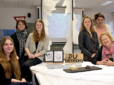 Saskia Hamacher, Kunstschulleiterin Katharina Braun, Susanne Dierdorf, Charlotte Stapper, Kunstlehrerin Anna Brockmann und Psychologin Dr. Alexandra Dithmer (von links) zeigten die Erinnerungen der OHG-Schülerschaft auch beim Tag der offenen Tür des Otto-Hahn-Gymnasiums an diesem Samstag nochmal. Foto: Thomas Spekowius