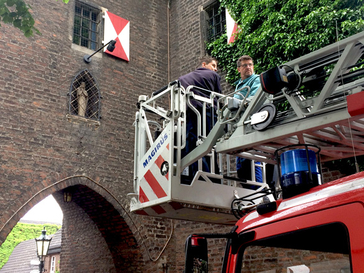 Mit Hilfe der städtischen Feuerwehr wurde die Madonnenstatue für Reinigungsarbeiten behutsam aus der östlichen Giebelseite des Schelmenturm-Torbogens geborgen. Das schützende Gitter ist übrigens genau in Augenhöhe der Figur unterbrochen, um der Madonna freien Blick über die Alte Schulstraße zu ermöglichen. Fotos: Marcus Brummel (Stadt Monheim am Rhein)