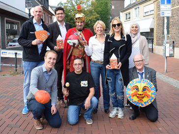 An der Doll Eck gibt es zum Abschluss des Martinsmarkts ein Martinssingen mit Mantelteilung. Sankt Martin in Gestalt von Herbert Reuter freut sich gemeinsam mit dem Treffpunkt-Vorsitzenden Dirk Fleschenberg, Bürgermeister Daniel Zimmermann, Kulturwerke-Geschäftsführer Martin Witkowski, Anke Mergardt vom Abenteuerspielplatz, Citymanagerin Petra Mackenbrock, Designerin Leonore Müller-Gladen, Naziha Zauaghi und Hans-Peter Anstatt von der städtischen Abteilung Integration, Ehrenamt und Pflege auf ein herbstliches Fest für die ganze Familie. Foto: Birte Hauke