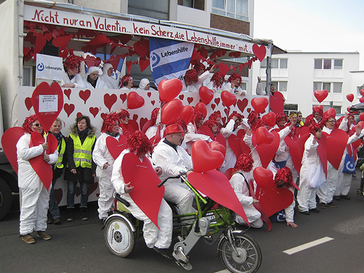 Das Herz der Lebenshilfe schlägt vor allem für die Menschen mit Handicap. Herzlich geht es im Alltag zu, und dies auch nach außen zu vermitteln, war der Wunsch aller Beteiligten. So lautete denn auch das Motto für den Karnevalswagen: „Nicht nur an Valentin … kein Scherz, die Lebenshilfe immer mit Herz.“ „Wir haben viele Stunden gebastelt, um alles vorzubereiten, und die Bewohner waren mit ganz viel Eifer dabei“, erzählt Gabriele Müller vom Betreuten Wohnen im Südkreis, die alle „Bastler“ angeleitet hat. Große Transparente wurden für den Motivwagen mit vielen roten Herzen bemalt. Für die gesamte Truppe – etwa 50 Leute – wurde auch ein „herzliches“ Kostüm angefertigt. Dazu mussten aus zwei großen Rollen roter Folie 120 Herzen aufgemalt und ausgeschnitten werden, für jeden zwei Stück.