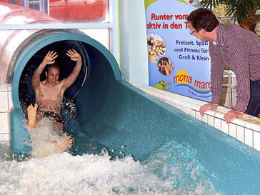 Die TÜV-Abnahme lief am letzten Freitag problemlos, und Bürgermeister Daniel Zimmermann stand als einer der ersten Testpiloten in Badehose bereit: Die neue Rutsche im mona mare kann an den Start gehen! „Die Besucher des Bades werden voll auf ihre Kosten kommen”, versprach das Stadtoberhaupt nach erfolgreichem Testlauf. Ab dem heutigen 15. Dezember ist das Allwetterbad nach zweiwöchigen Instandsetzungsarbeiten wieder geöffnet. Und dann kann natürlich auch die neue Rutsche erkundet werden. Sie ist 65 Meter lang. Der Hit: Die Badegäste gleiten durch einen illuminierten Tunnel. „Die verschiedenen Lichteffekte bescheren auch optisch einen riesigen Spaß“, erläutert Allwetterbad-Geschäftsführer André Zierul.