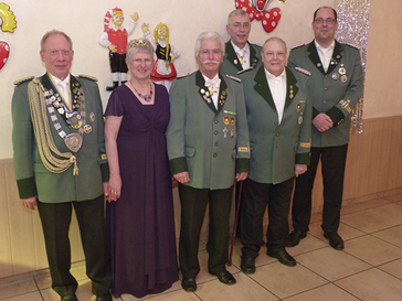 In der Schießsportanlage begrüßte der zweite Brudermeister Christoph Boes die Gäste. An erster Stelle natürlich das Königspaar Manfred und Annegret Herkenrath. Auch Stadtkönig Bernd Müller und Tellkönigin Miriam Müller waren mit von der Partie. Nach dem Einmarsch des Königspaares stärkten sich die Gäste zunächst am reichhaltigen Buffet. Gleich darauf wurde es richtig voll im Saal. Mit dem Langenfelder Prinzenpaar Andre und Sophie zog eine stattliche Abordnung der heimischen Karnevalsgesellschaften ein. Prinz Andre grüßte das Königspaar und die übrige Festgesellschaft. Nach der Vorstellung seines Prinzenteams stimmten die Karnevalisten mit dem Festkomitee-Vorsitzenden Helmut Schoos ein paar fröhliche Lieder an. Natürlich hatten Prinz und Festkomitee auch Orden für die Schützen im Gepäck. Der Schützenkönig Manfred Herkenrath erhielt den Prinzenorden von Prinzessin Sophie und dem Schriftführer Stephan Clemens wurde der Sessionsorden verliehen. Die Schützen revanchierten sich mit kleinen Gastgeschenken und eigens für diesen Anlass angefertigten Karnevalsorden mit Schützenmotiv. Zur Musik des „Casablanca Duos“ füllte sich anschließend die Tanzfläche. Christoph Boes, der den verhinderten Brudermeister Guido Joch vertrat, nutzte den feierlichen Rahmen der Veranstaltung, um langjährige Schützenbrüder zu ehren. Hans-Gerd Müller ist seit 40 Jahren dabei. Gleich drei Schützen feiern in diesem Jahr 50 Jahre Mitgliedschaft in der Bruderschaft. Die Jubiläumsnadel in Gold ging an Hansjakob Holterbosch und Willi Markett. Der Dritte im Bunde, Heiko Ockenfels, konnte leider am Patronatsfest nicht teilnehmen.