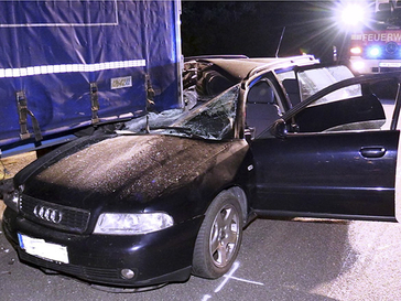 Ein Pkw hatte sich unter den stehenden Sattelauflieger eines Lkw geschoben und war im Beifahrerbereich komplett zerstört. Glücklicherweise war der Fahrer des Audis alleine mit dem Fahrzeug unterwegs, so dass im Beifahrerbereich keine Person verletzt wurde. Der verletzte Fahrer wurde nach notärztlicher Erstversorgung mit dem Rettungswagen der Feuerwehr in ein Krankenhaus transportiert. Zur Unfallaufnahme durch die Polizei leuchtete die Feuerwehr die Unfallstelle noch aus. Im Einsatz war die hauptamtliche Wache mit Löschgruppenfahrzeug, Rüstwagen, Rettungswagen und Notarzteinsatzfahrzeug.