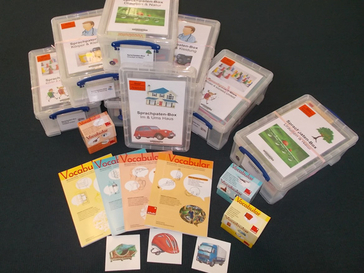 Jetzt gibt es ein neues Angebot gezielt für die Sprachpaten von Kindern und Jugendlichen, das mit einer Förderung durch Landesmittel verwirklicht werden konnte. In zwölf Boxen sind jeweils Vokabelboxen, Lesepuzzles, Bildwörterbücher und Kopiervorlagen für Arbeitsblätter zusammengefasst. Die Materialien sind nach sechs Themenbereichen inhaltlich sortiert. Themenbereiche sind etwa „Draußen und Natur”, „Im und ums Haus” oder auch „Kinder und soziales Umfeld”. Die Boxen können für vier Wochen entliehen und gegebenenfalls verlängert werden. Neben diesem Angebot gibt es noch weitere Unterstützung für die ehrenamtlichen und hauptamtlichen Sprachlernhelfer. Fragen kann man an die Mitarbeiter in der Stadtbibliothek richten.