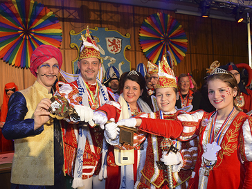Auch zuvor hatte Zimmermann, von zahlreichen Gardisten und den neuen Regentschaften umringt, nochmal beteuert, wie kräftig in Monheim doch nun seit gut fünf Jahren schon an Aladins Wunderlampe gerieben wird. Seine Amtsgeschäfte musste er dennoch niederlegen. Immerhin passt ins Bild, dass auch das diesjährige Stadtfest unter dem märchenhaften Motto „1001 Nacht” gefeiert werden soll. Nach heftigem, doch erfolglosem Widerstand hatten sich der Bürgermeister und seine Verwaltungstruppen zuvor Prinz Bernd II. und Prinzessin Silke mit ihren Getreuen ergeben müssen. Um Punkt 9.11 Uhr waren Monheims Garden nach kurzer Belagerung des Rathauses direkt zum Angriff übergegangen, auch unterstützt durch Kinderprinz David und Kinderprinzessin Jil. Statt Blut flossen bei dieser Revolution des Narrenvolks jedoch nur Bier und weitere Kaltgetränke. Schon kurz nach der Erstürmung kam es im Ratssaal sogar zu erstaunlichen Verbrüderungsszenen und gemeinsamen rheinisch-orientalischen Tänzen. Nach ausreichender Stärkung zogen Sieger und Besiegte dann schließlich gemeinsam zur Doll Eck weiter, um dort dem Regen zu trotzen und den Beginn des Monheimer Straßenkarnevals zu feiern. Helau! (ts)