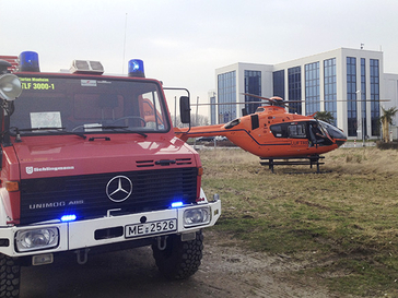 Der zuerst eintreffende Rettungswagen der Feuerwehr forderte die Unterstützung durch ein Löschfahrzeug an, um die Person aus dem Obergeschoss der Baustelle zu retten. Nach notärztlicher Erstversorgung wurde Rettungshubschrauber Christoph 9 aus Duisburg angefordert, der den Patienten in eine Spezialklinik transportierte.