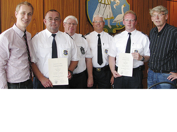 Im Ratssaal wurde die alte Feuerwehrführung verabschiedet und die neue begrüßt (von links): Bürgermeister Daniel Zimmermann, der stellvertretende Leiter der Freiwilligen Feuerwehr Achim Bremer, der scheidende Wehrchef Werner Opherden, der neue Wehrchef Hartmut Baur, der neue stellvertretender Wehrchef Torsten Schlender und Ordnungsbereichsleiter Uwe Trost. Foto: Feuerwehr