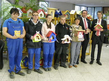 Michael Melzner hat die Mitarbeiter/-innen bei den Holzarbeiten angeleitet: aufzeichnen, aussägen, bohren, Kanten schmirgeln, zusammen montieren. Kreative Hände brauchte es dann noch für die Farbgestaltung. Am Aufbau beteiligten sich mehrere Mitarbeiter aus dem Berufsbildungsbereich, aber auch Sparkassen-Vorstand Stefan Noack, Filialleiter Daniel Wolter und Pressereferentin Sabine Schwetka packten mit an. Alle Teile kann man auch erwerben (Vogelhäuschen und Nistkästen für 22 Euro, Spardosen für 8,50 Euro).